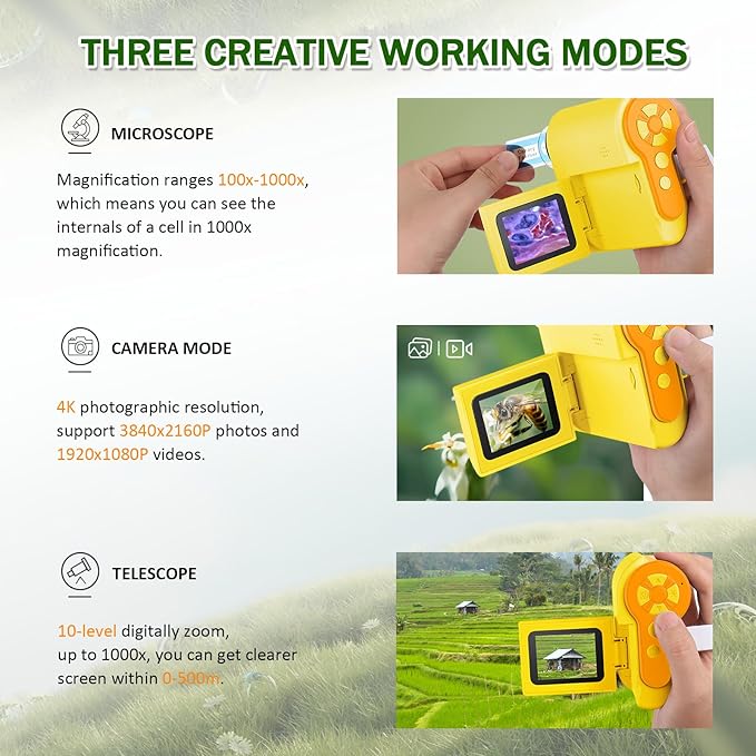 • ๐Ÿฏ-๐—œ๐—ป-๐Ÿญ ๐——๐—ฒ๐˜€๐—ถ๐—ด๐—ป: 1) Microscope Searching, 2) One-Click Photo & Video Recording, 3) Telescope, choose what you want to enhance child's learning experience. And this digital microscope made of 4K resolution, provides much higher clarity