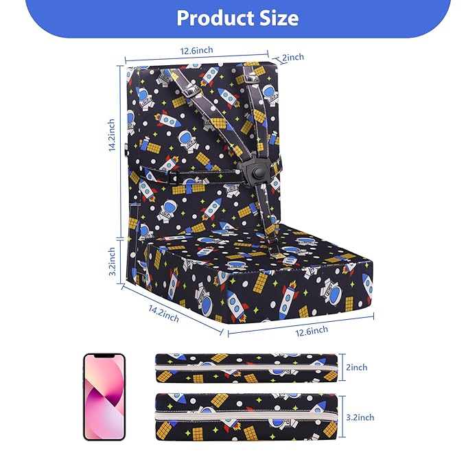 • WIDELY USED: The thickness/ firmness of the cushion and large size means that it works for a variety of ages. Older children can skip getting buckled in and just use the cushioned seat. This versatility ensures that the booster seat can be used with a variety of dining chairs and tables, making it suitable for different households or when dining out. It arrives vacuum packed, expands immediately and recover to its original height within 24-48 hours once you open the plastic