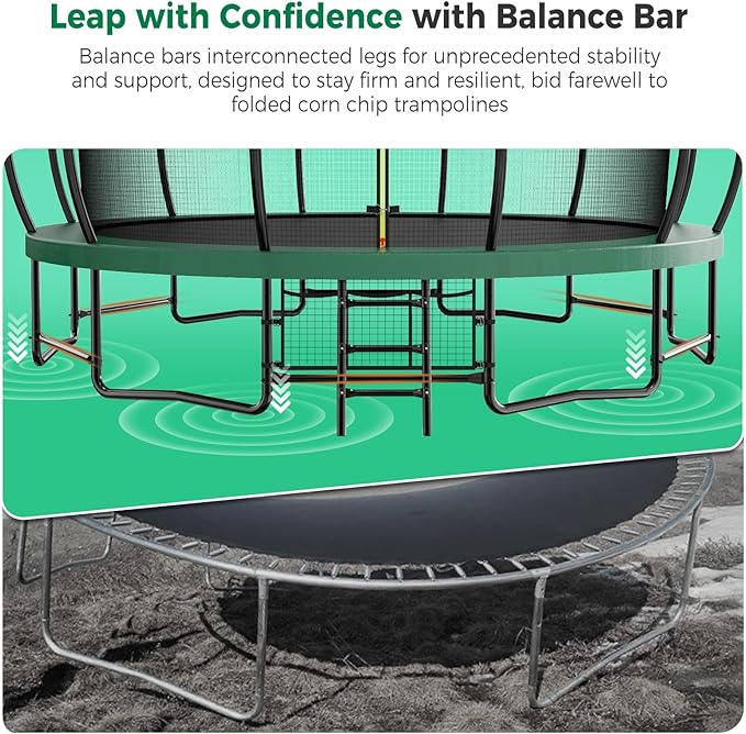• 【A Professional-Sized Trampoline】Every kid dreams of having a huge trampoline, and our 15FT trampoline fulfills that dream. It's spacious enough for multiple kids and adults. Use it for outdoor movie nights with the family or whatever your heart desires