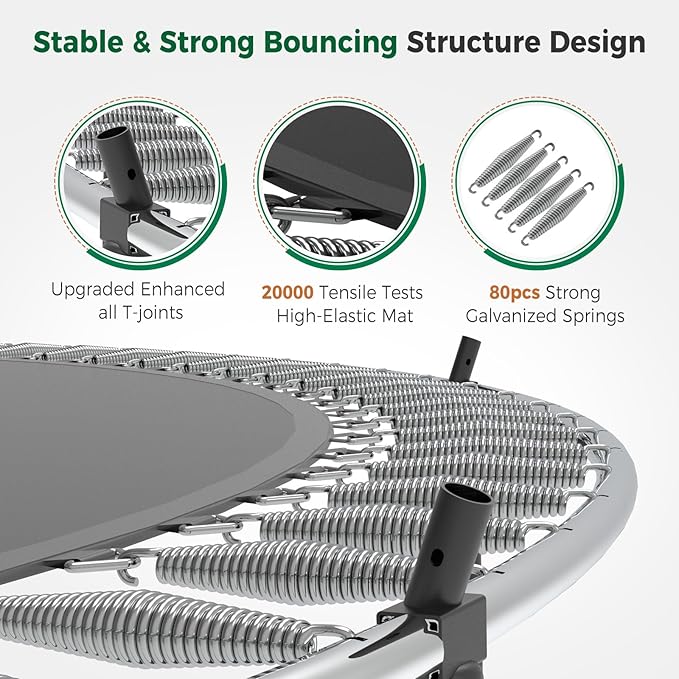 • 【Premium Bouncing Experience】This Tatub large trampoline is supported by 80 robust springs, guaranteeing stability with every bounce. Its heavy-gauge galvanized steel frame forms 4 W-shaped legs with bars, providing a solid foundation for the jumping zone