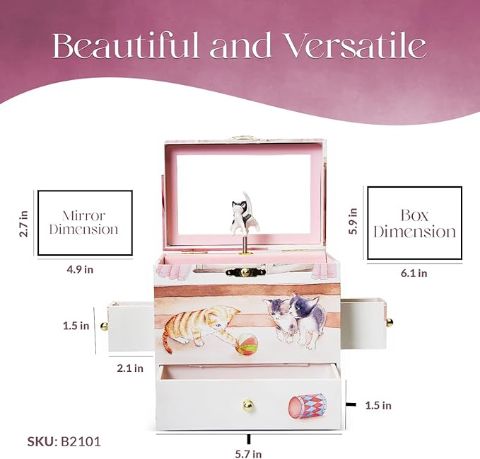 • 🧶 MULTI-FUNCTION: Not just a beautiful music box, this enchanting item contains multiple drawers to store trinkets and jewelry, seamlessly combining aesthetic allure and practical functionality. Our musical jewelry box measures 6 x 4 x 6 in. with 1 big compartment & a few hidden small drawers. This provides ample space to store all jewelry items and precious treasures in one place, creating a safe home for memories to be kept. You’re not just giving a jewelry box with a dancing kitty cat - you are encouraging organizational skills that any child will hold onto for years to come.