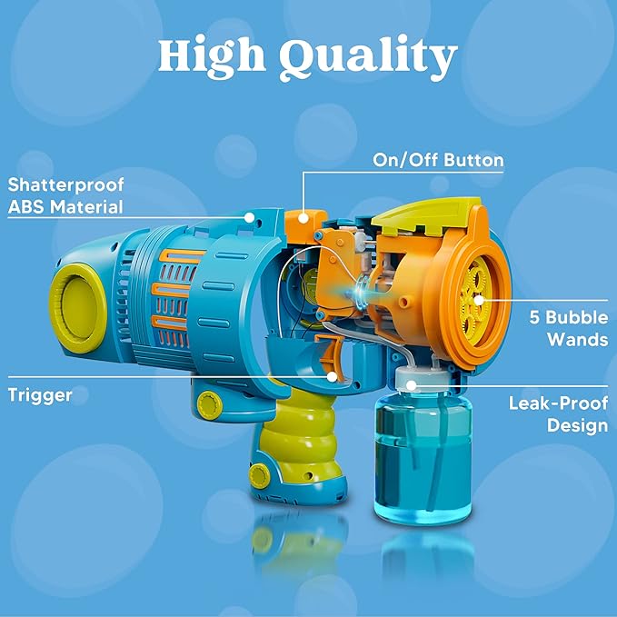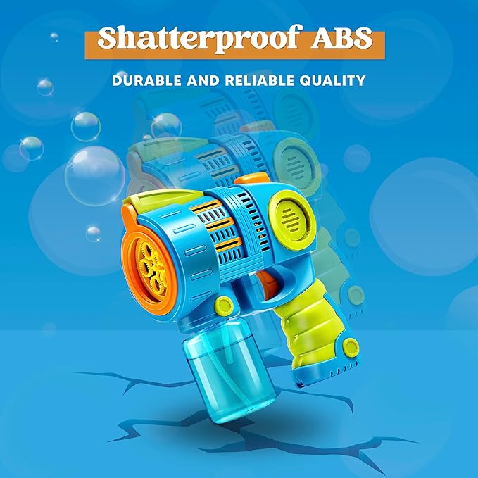 • SHATTERPROOF MATERIAL, LEAK-PROOF DESIGN. This premium quality automatic bubble gun is made out of ABS sturdy and shatter-resistant. The leak-proof silicone sealing ring perfectly fits the bubble gun and bottle. This Bubble Gun Machine proof leak bubble solution no matter how shaken.