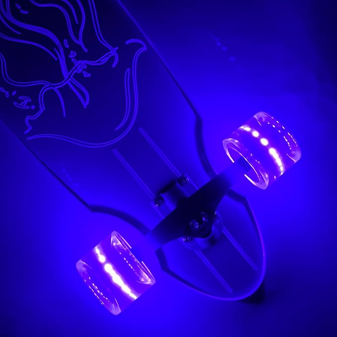 • Fully Assembled Setup: This complete skateboard includes pre-mounted trucks, friction-powered LED wheels, and a skate T-tool for tuning. It's suitable for all skill levels-from first rides to more advanced motion. The versatile look complements those who enjoy bold rides with a longboard skateboard adult vibe. It aligns with preferences for a clear-bodied build, such as a clear light-up skateboard.