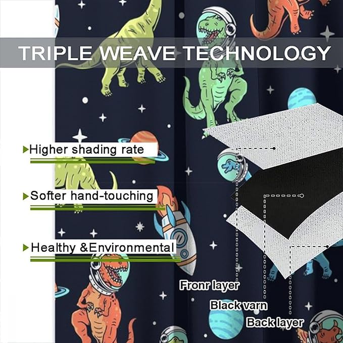 Cartoon Dinosaur Curtains for Kids Boys Girls Home Decor, Astronaut Rocket Funny Outer Space Blackout Rod Pocket Window Drapes for Bedroom Living Room W27.5xL63in 2 Panels