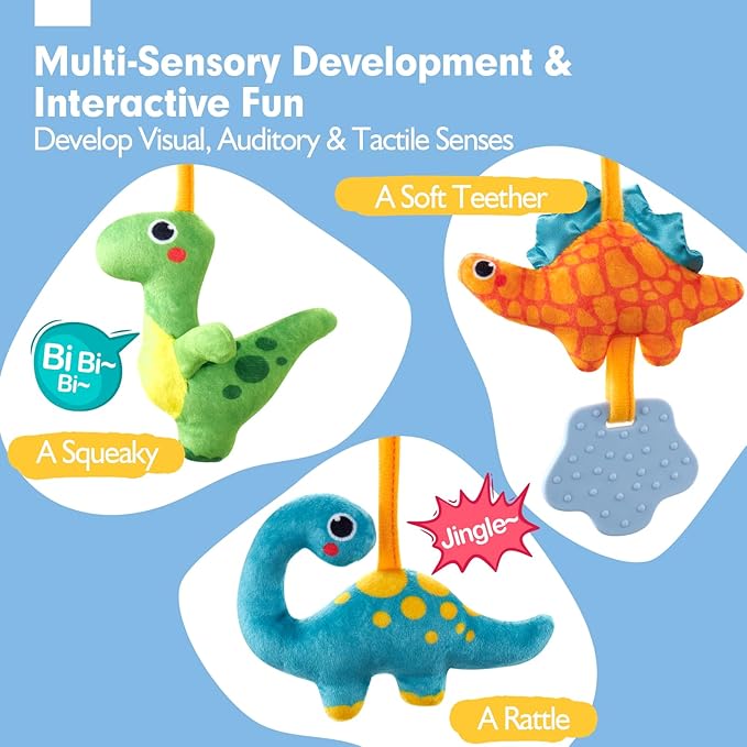 • Baby-Safe Designs: Made from non-toxic, BPA-free, premium PP cotton, our dinosaur car seat toys are ultra-soft, skin-friendly, and safe for babies and infants. Strong stitching ensures durability and safety during play