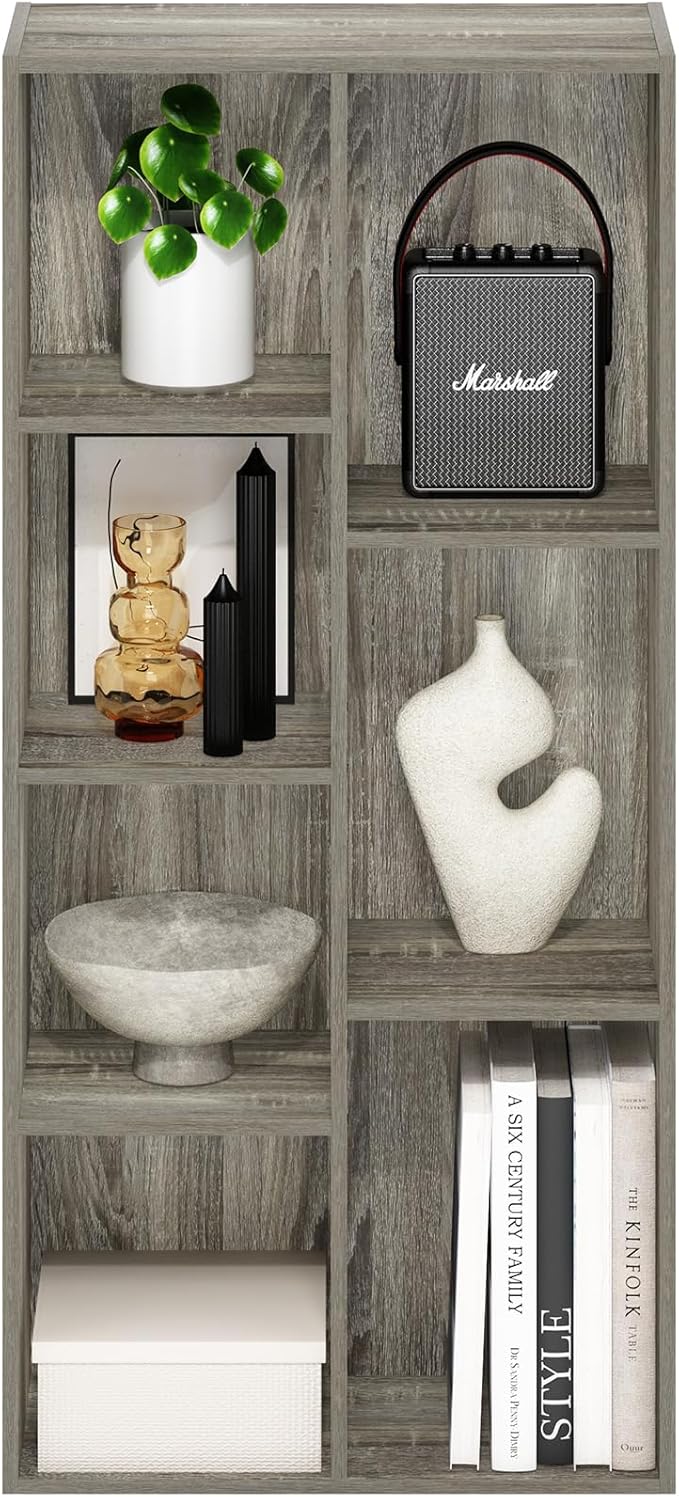• Features 7 open shelves storage compartments of two distinct sizes offering versatility in display or storage options.
