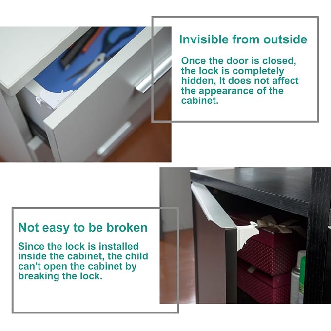 • Hidden Magnetic Lock : Compared to traditional cabinet locks, this child proof magnetic cabinet lock is installed inside the cabinet and opened with a magnetic key. After the door is closed, the toddler cabinet locks is completely hidden inside the cabinet.