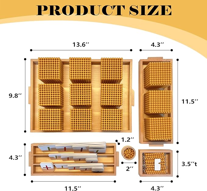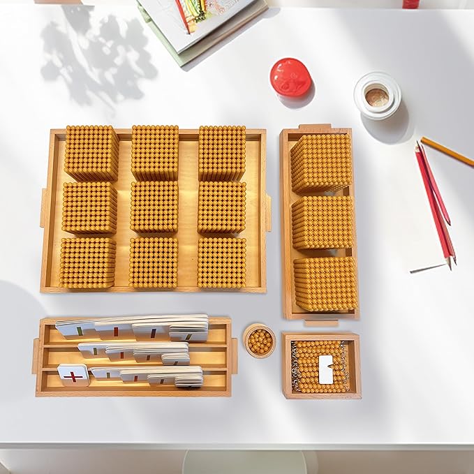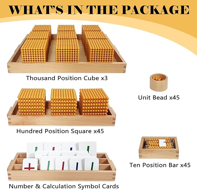 • 【Package Essential Elements】45 of unit beads. 45 of ten position bars. 45 of hundred position squares. 9 of thousand position cubes. 1 set of operator cards. 1 set of 1-9000 large cards. 2 sets of 1-9000 small cards. 5 wooden storage trays.