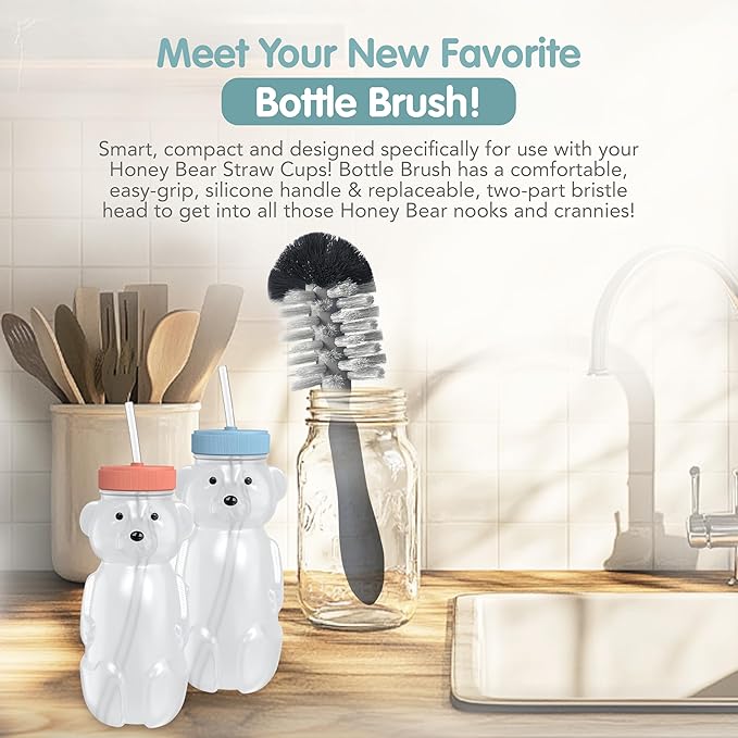 • Complete Set: Our easy squeeze straw cups set comes with 2 bottles + lids, 4 straws, a custom bottle brush, & a straw cleaner. These BPA-free & recyclable honey bear bottles with straws are leak-resistant, dishwasher-safe, & easy to clean & maintain.