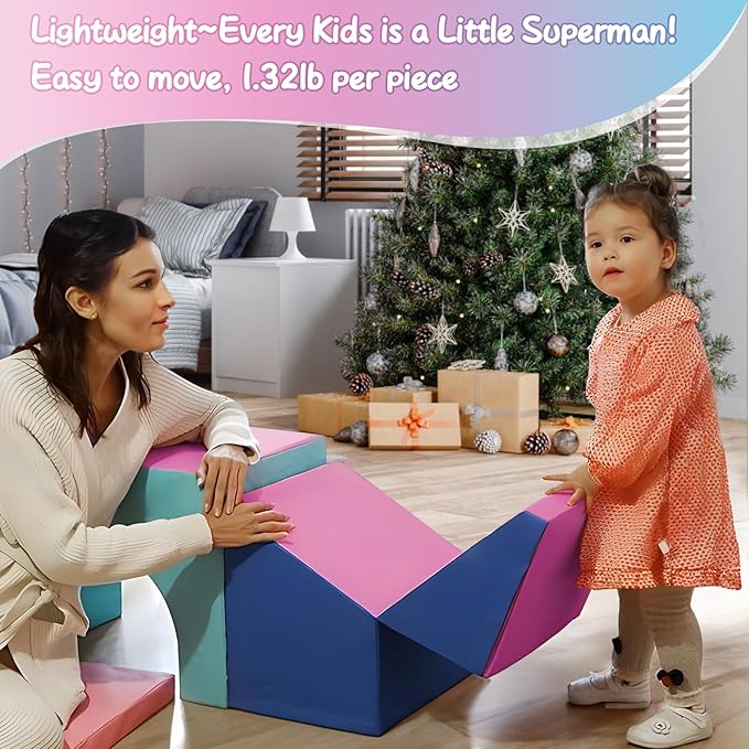 • TWO WAYS TO PLAY:The slope climbing toys in the toddler foam climbing blocks can be folded into a square or put down to use as a slide, which not only increases kid's interest but also creates building ability for them.Brightly colored foam blocks can not only be combined into various shapes, but also become seats for little princesses and princes!