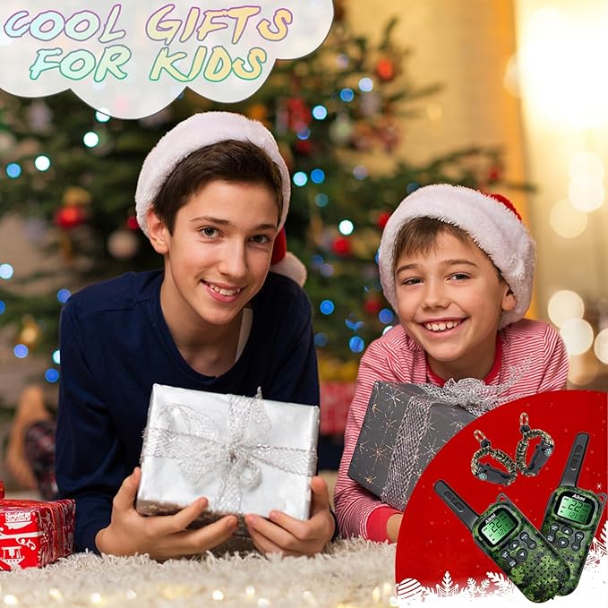 • PERFECT GIFTS FOR BOYS AND GIRLS: These walkie talkies for kids are the ideal gift for any child. With their compact size, great sound, long range, and extended battery life, they are both convenient and easy to use. Whether it's for a birthday, Christmas or any other holiday, these walkie talkies are sure to be a hit with your kid, nephew, grandchild, or your friends' children