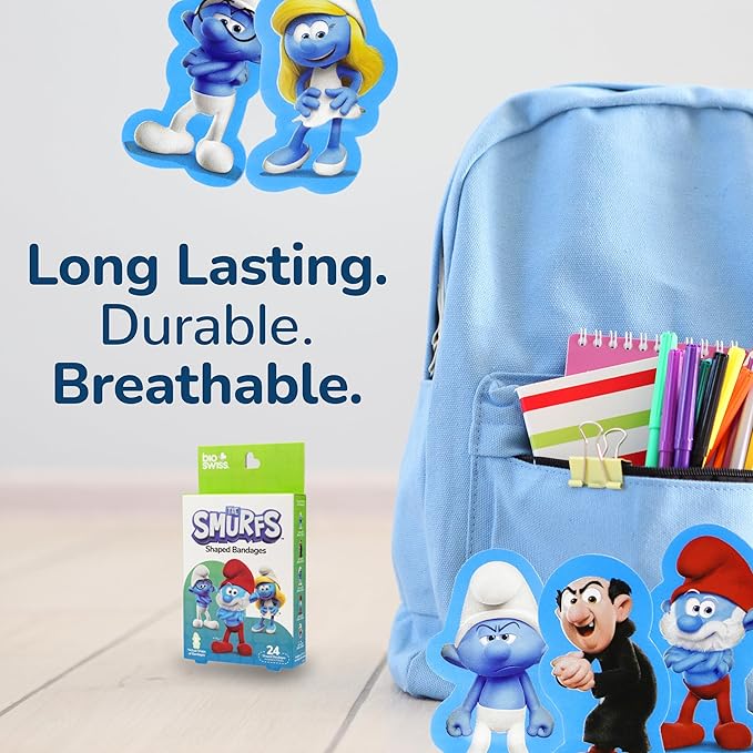 BioSwiss Bandages, The Smurfs in 3D Shaped Self Adhesive Bandage, Latex Free Sterile Wound Care, Fun First Aid Kit Supplies for Kids and Adults, 24 Count Box