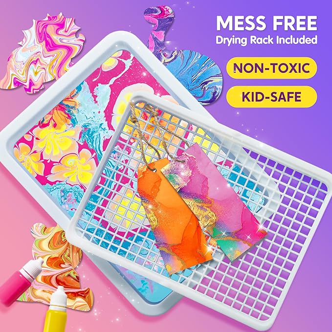 • Mess-free with Drying Rack: Our kit includes a perfectly sized drying rack that matches the art tray, effectively containing paint drips and promoting efficient drying of your marbled creations. Enjoy the convenience of hassle-free drying by simply placing your artwork on the rack and maintaining a tidy workspace.