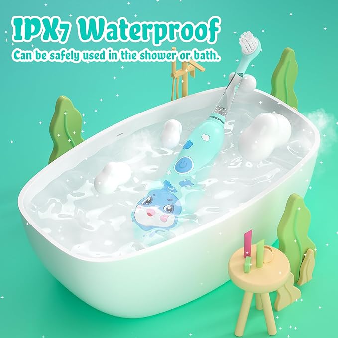 • Rechargeable, Fast and More Safe: Magnetic Charging technology, toddler electric toothbrushes rechargeable is fully charged in 4 hours and the battery lasts up to 60 days. IPX7 waterproof is designed for safe use in the bathroom or shower