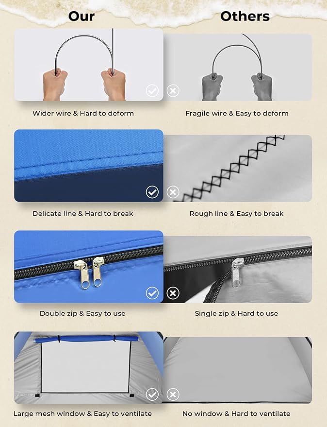 • Windproof Strengthen: Glymnis Pop Up Beach Tent using 5×1.8mm(S), 7×2mm (L) support poles, equipped with 4 guy ropes and 10 ten pegs, make the tent stronger, no need to worry about being blown by the wind, you can enjoy the happy time