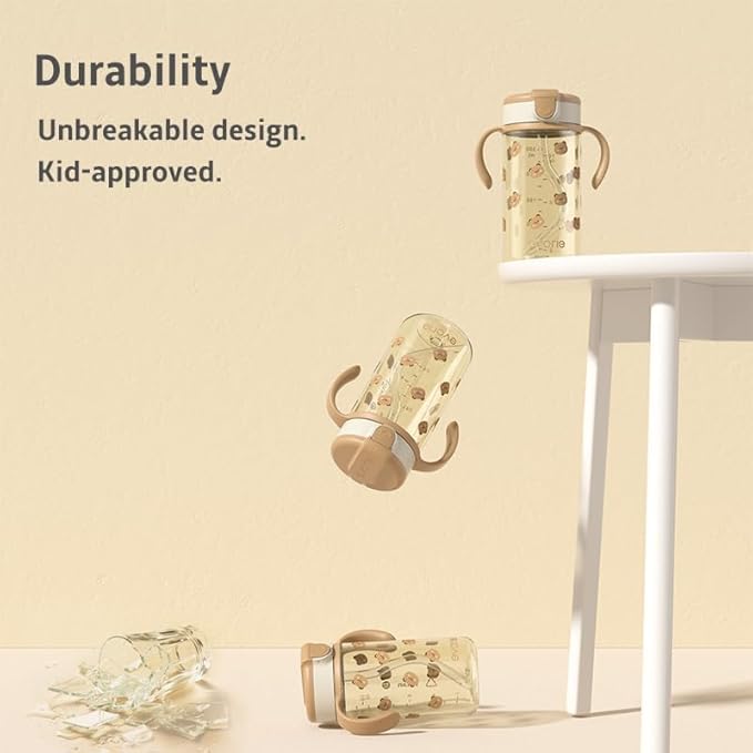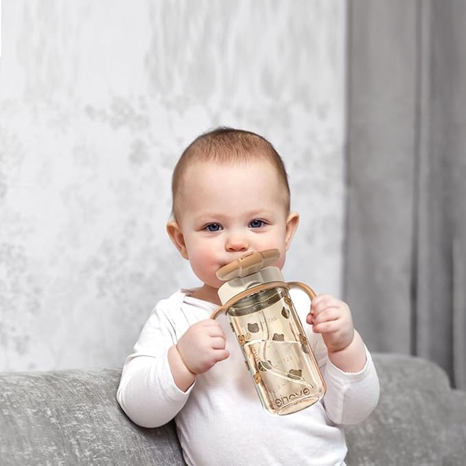 Evorie Tritan Spill Proof Toddler Straw Sippy Cup, 10 oz for Baby and Toddlers 1-3 Years Old, No Spill Straw Water Bottle with Removable Handles, Ideal for School, BPA-Free, Honey Bear
