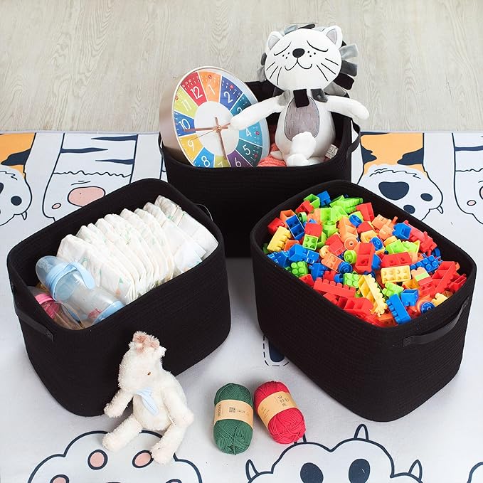 MINTWOOD Design 3-Pack Storage Baskets for Shelves, Decorative Baskets for Organizing, Woven Baskets for Storage, Book Basket Cube Bin Box, Pantry Closet, Shoe Organizer, Black / Black