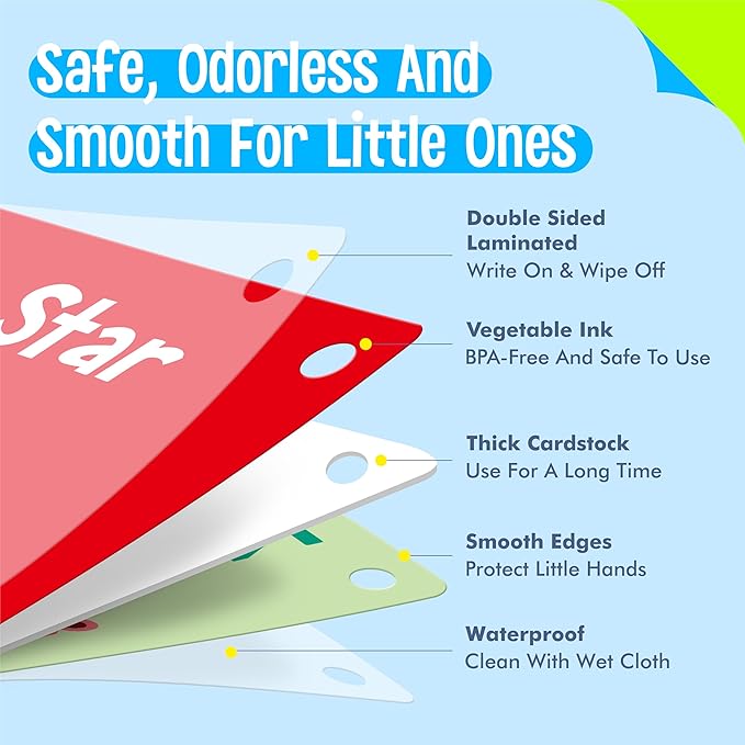 • Easy to Use and Storage: The flashcards are lightweight and well-packed, perfect for on-the-go learning and travel friendly. It measures about 3.7” x 4.7”, proper size for toddlers’ little hands. Come with 2 rings for easy sorting and organization.