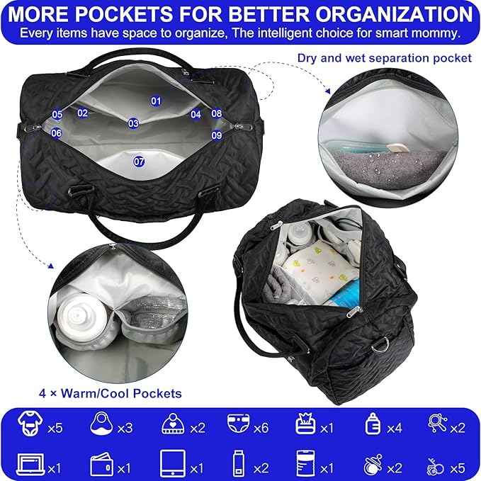 • MULTI POCKET MOMMY BAG:Mommy bag has 15 pockets and a diaper changing bag. Insulated bottle bag 4, dry and wet separation bag 1, privacy bag 1, flat bag 3. The main warehouse with large opening mainly stores diapers, paper towels, milk powder, clothes, shoes and hats and other daily necessities. External pockets can store emergency items without having to search the main bag. Travel companion, modern style mommy bag, personalized design of travel diaper bag