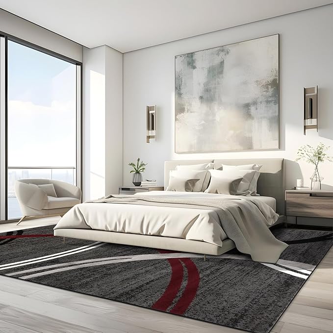• Dynamic Wavy Circles Design: The rug boasts an artistic pattern with fluid wavy circles, available in blue, brown, gray, red, black, and yellow to complement any room's palette.