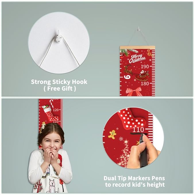 • CHRISTMAS GROWTH CHART SIZE & MATERIAL - 77"x7.9"/195 cm x20 cm(L x W). The Xmas wall hanging ruler can be actually measured up to 79 inches (200 cm). Made of hanging rope, wood pieces and cotton canvas, waterproof, durable. Add the kids name and make the growth chart special!
