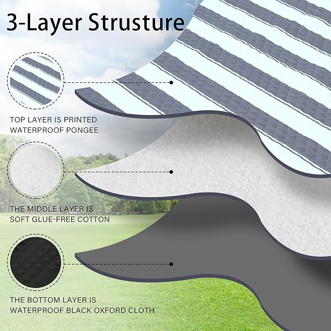 • 【Soft and Durable with 3-Layers】The picnic blanket top layer is printed waterproof pongee, the middle layer is soft glue-free cotton, and the bottom layer is waterproof black Oxford cloth. Perfectly suitable for siting or lying on grass, beach, floor or any kindly of surface, giving you soft and comfortable feelings.