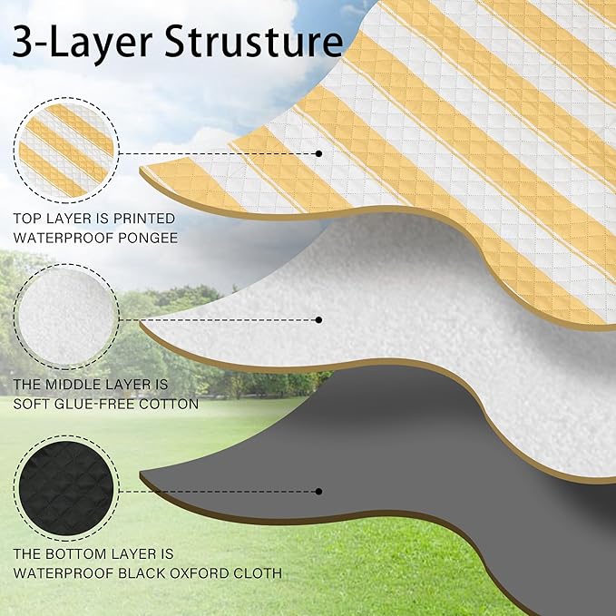 • 【Soft and Durable with 3-Layers】The picnic blanket top layer is printed waterproof pongee, the middle layer is soft glue-free cotton, and the bottom layer is waterproof black Oxford cloth. Perfectly suitable for siting or lying on grass, beach, floor or any kindly of surface, giving you soft and comfortable feelings.