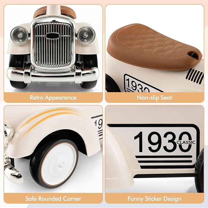 • 【Retro Appearance & Safe Design】With charming retro style and 2 funny stickers, this kids ride on car is sure to catch your child's eye. The air horn with beeping sound offers endless fun. Plus, the safe rounded corner and non-slip seat add additional safety, making the toddler riding toy a safe choice for your infants.