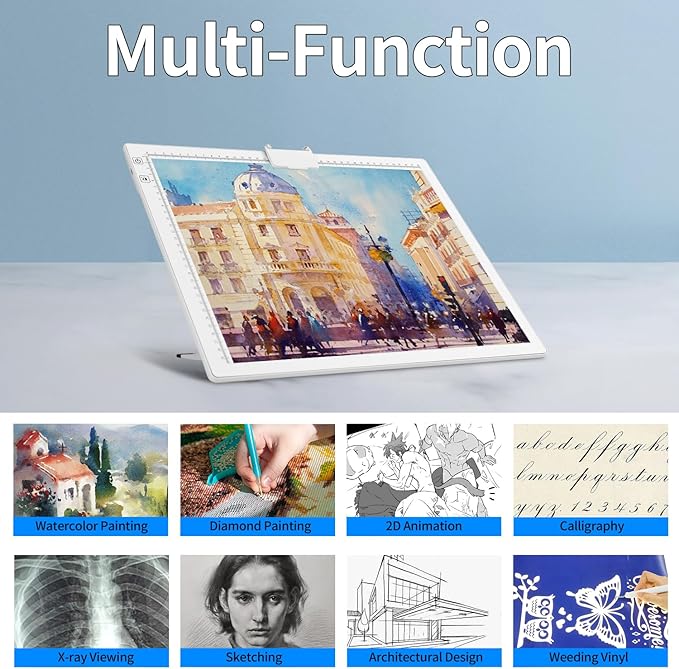 • 【 A3 Size, Large LED Light Pad 】 The dimmable LED Light Box has a working area 15.2" * 11.9", large enough for both big and small diamond painting projects, HTV vinyl weeding, Drawing, Scrapbooking, Tatoo Trasferring and so on. It keeps slim and compact due to our unique design, good to use on the go.