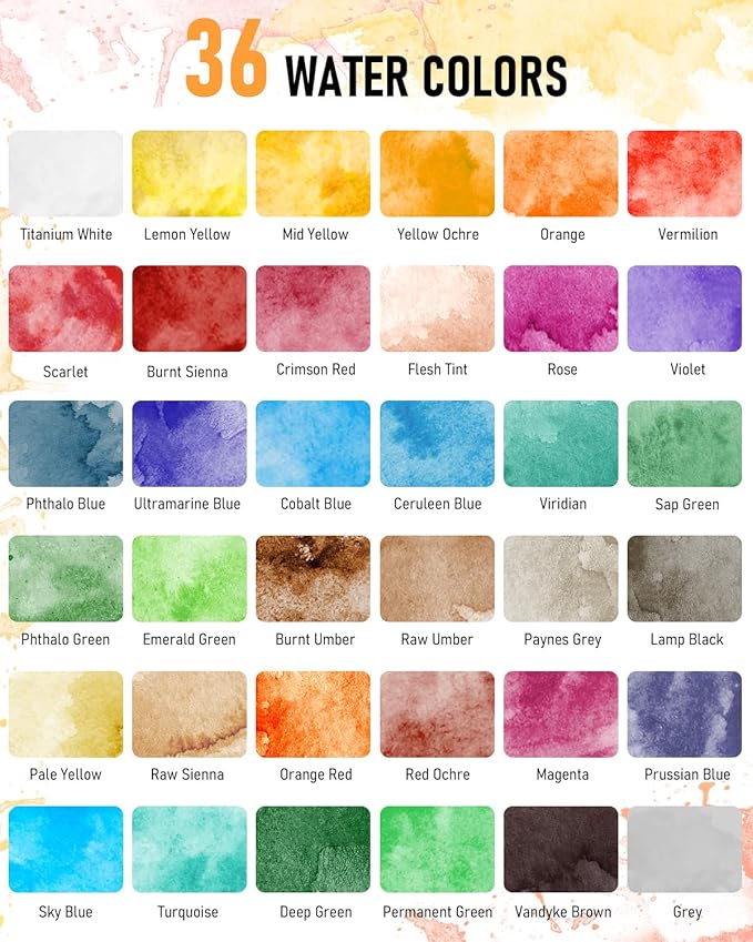 • 78PCS Complete Kit:Come with 36 Tubes premium quality watercolor paints, 8 synthetic painting brushes, plastic mixing palette and 25-sheet watercolor papers, art sponges, pencil, eraser, sharpener, masking tape, color Wheel, you can start creating colorful masterpieces right away. User Instruction for beginner included.