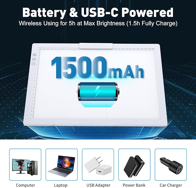 • 【 Battery and USB-C Powered 】 The light tracing box let you enjoy the convenience of working wirelessly at anywhere you like with the built-in battery. This rechargeable light pad can work for approx 5 hours after fully charged(1.5h). Battery and USB-C power mode are both available. Also, the USB-C interface is more stable than the Micro interface.