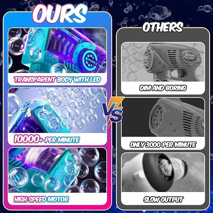 • ✅【High Output Bubble Maker】Our bubble blower features a high-speed motor and 10 holes outlet, allowing it to produce over 10,000+bubbles per minute. Whether it's day or night, this bubble guns will create amazing effects and provide hours of entertainment for kids.