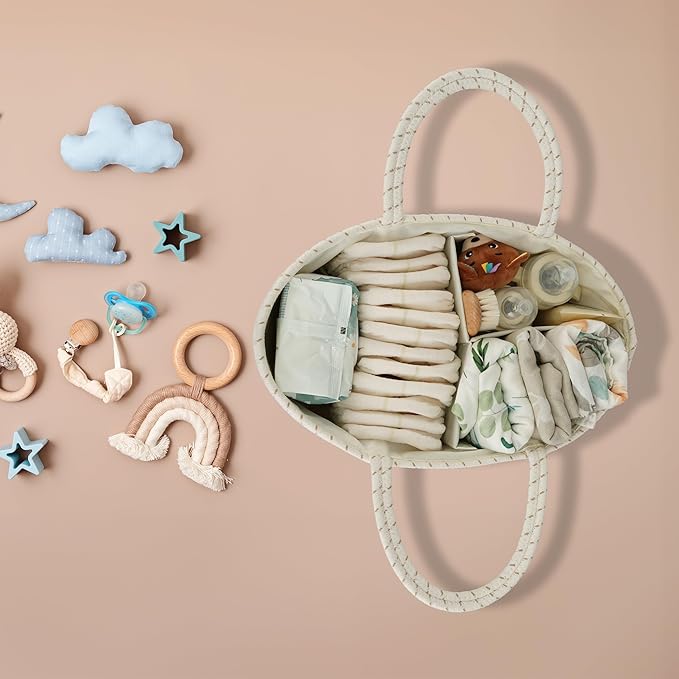 • Flexible and Portable Diaper basket with removable divider: Featuring handles for effortless transportation, our diaper change caddy includes removable dividers for personalized organization. Adjust the internal layout as needed to accommodate various baby items. Move seamlessly from room to room or take diaper organizer caddy on the go for convenient access to baby essentials.