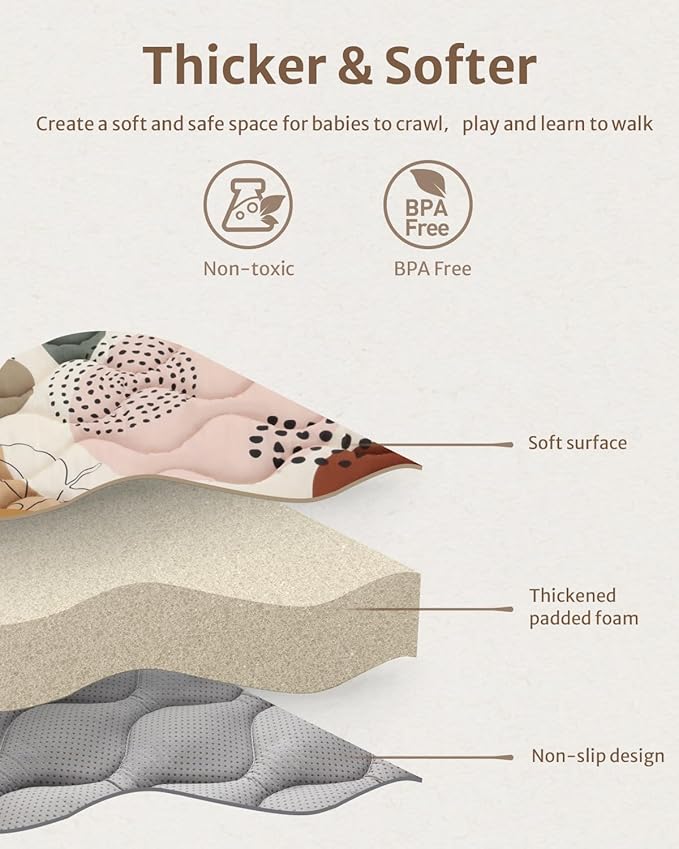 • Thicker & Soft Premium Foam - Our baby play mats for floor is thicker than most other brand baby play mat. And it's made of premium soft padding foam and fabric top layer to ensure a soft and cushioned surface, providing a comfortable place for your little one to relax, play and work on their developing skills