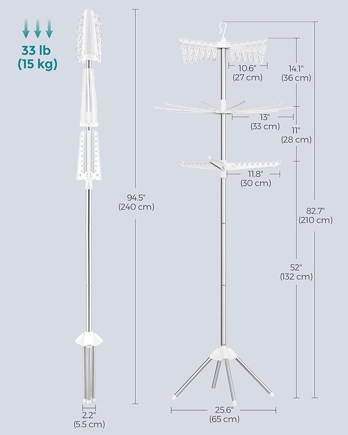 • [Foldable & Space-Saving] Standing at 25.6"D x 25.6"W x 82.7"H during use, this clothes drying rack takes up little space, perfect for small spaces. Fold the arms and legs into a small size of 2.2"D x 2.2"W x 94.5"H, it will stay out of the way after use
