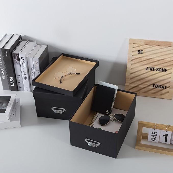 • SLEEK MODERN AESTHETIC: Elevate your home or office decor with these elegant black cardboard storage boxes. Featuring a sophisticated linen-like texture and silver hardware, they blend seamlessly with contemporary interiors while providing functional storage. The matte black finish adds a touch of understated luxury to any space.