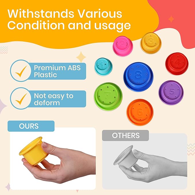 • DURABLE & SAFE - Our toddler stacking cups are manufactured with high-quality, BPA-free, non-toxic materials to ensure your child's safety. These stack cups form an excellent and secure playtime companion being the perfect stackable cups for babies, they are designed with utmost care to be both enjoyable and safe.