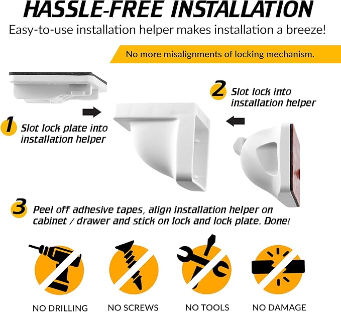 • EASY INSTALLATION: Our unique baby-proofing drawer lock is made by experts to ensure you get the best. It is easy to install with two installation methods. You can use the red 3M VHB adhesive tape or screws provided.