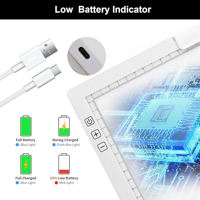 • 【 Built-in Battery and USB-C Powered 】 Our LED lightbox comes with a internal battery which allows you to use it any where without any power source, which makes your project more convenient as well as more enjoyable! Works for around 5 hours after charged 1.5 hours at a time. This A4 lightpad uses a USB-C interface to easily access any USB port, such as a USB wall charger, computer, laptop or mobile power bank. Also,the USB-C interface is more stable than the Micro interface.