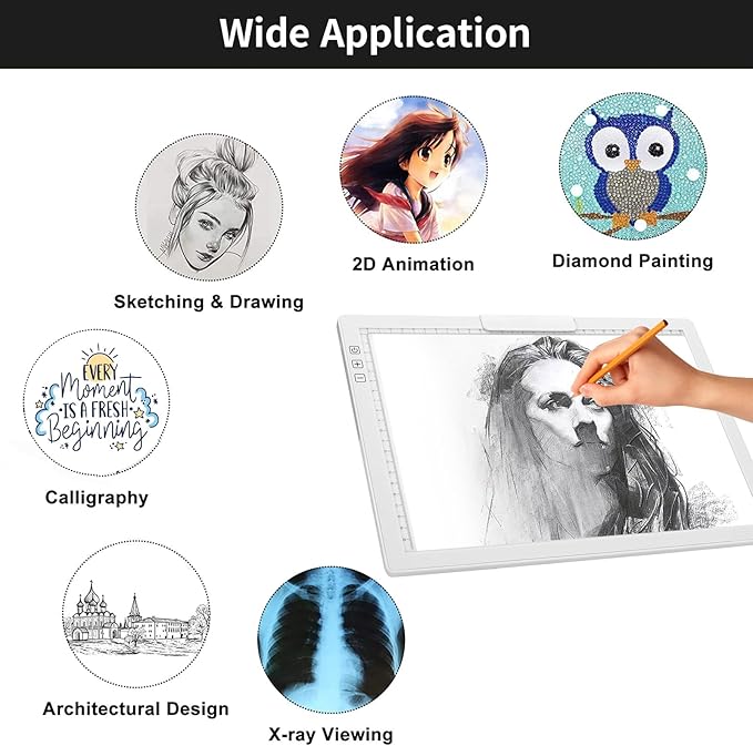 • 【 Wide Application 】 A4 tracing drawing board is large enough for diamond painting, weeding vinyl. It's also ideal for stenciling, 2D animation, calligraphy, embrossing, scrapbooking, tattoo transferring, sketching & drawing, streaming, sewing projects, stained glass, quilting etc. Best gifts for Christmas, Birthday or other holidays. If you are not satisfied with your purchase, please contact us, we will reply you within 24 hours.