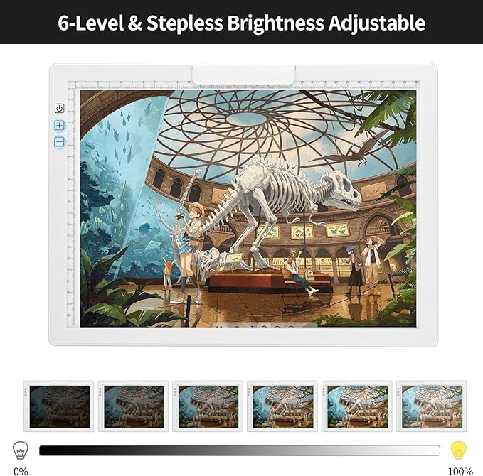• 【 6-Level/ Stepless Dimmable Brightness 】 Gives a STEPLESS change in brightness by long press on the touch button, shortly press to choose 6 levels brightness. To meet your different needs. With 3000-6500K color temperature, it's bright enough to lit up through a few layers of paper evenly without glare. No longer to strain your eyes during tracing your drawing.