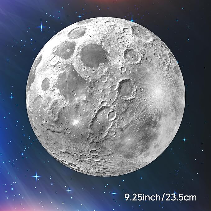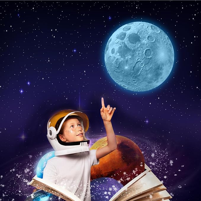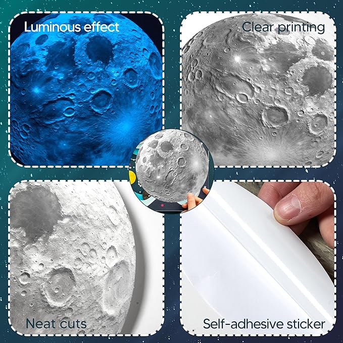 • Robmoda Glow in The Dark Planet - One piece of moon sticker made up of non-toxic, eco-friendly, waterproof, pressure resistant, shock resistant& durable fluorescent PVC. It comes in 23.5 cm (9.25”).