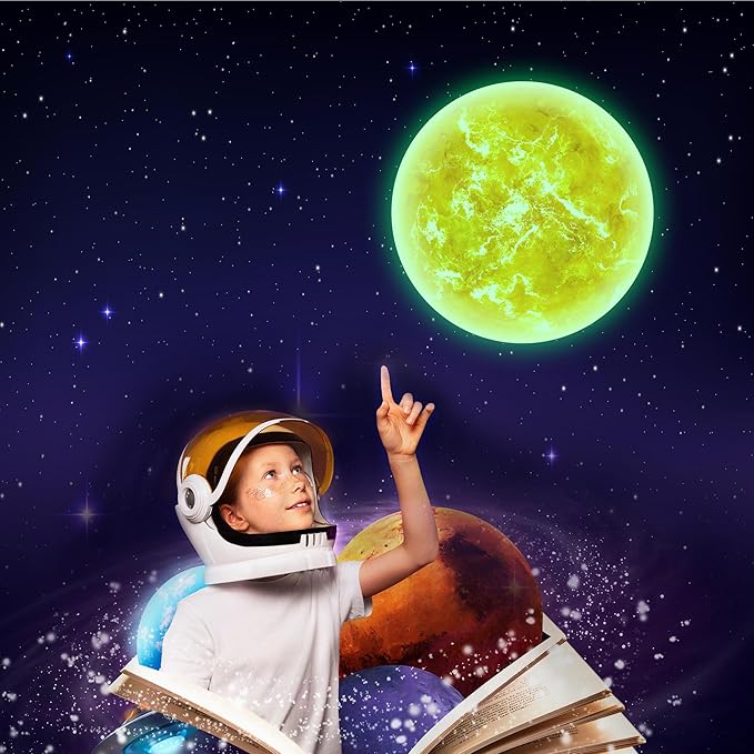 • Robmoda Glow in The Dark Planet - One piece of sun sticker made up of non-toxic, eco-friendly, waterproof, pressure resistant, shock resistant& durable fluorescent PVC. It comes in 23.5 cm (9.25”).