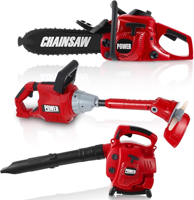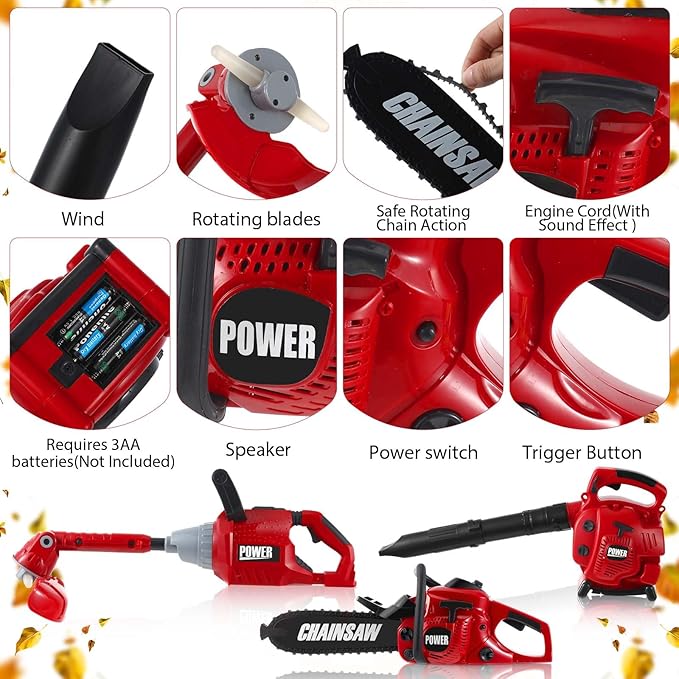 • Complete Play Tool Set for Kids: our kids lawn equipment toys set is a nice bundle to keep your child entertained and engaged; The set includes a fake leaf blower, a fake lawn trimmer line, and a fake chainsaw, all designed to match real world models; In bold red and black colors