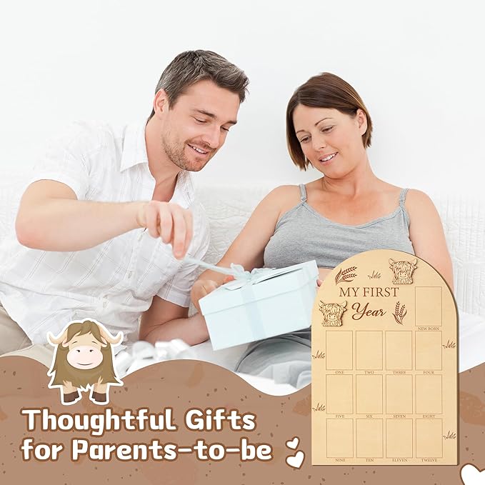 • Cute Highland Cow Design: Our baby picture frame come with hook and point stickers for you to hang and decoration. It is made of quality and thick wooden material for long-term use. The highland cow board with your baby's photo pasted on it will surely be the most beautiful sight at your baby's first year party.