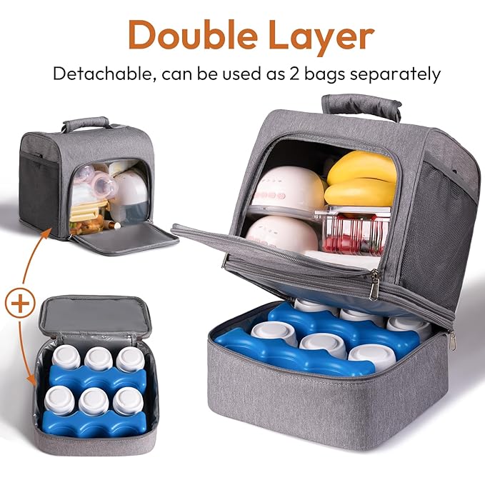 • Flexible Use Anywhere: The detachable double-layer breast pump bag adapts to your needs. It can be used as one complete backpack or two separate organizers. The top layer is used to store breast pumps and accessories, etc. The bottom layer can store items that need to keep fresh, such as breast milk, baby food, fruits