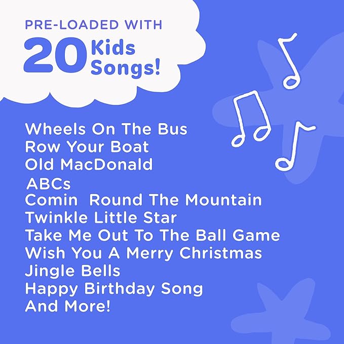 • 20 NURSERY RHYMES : Create a concert in your living room! Pre-loaded with toddler fav’s like Twinkle Twinkle Little Star, Wheels on the Bus, ABC's, and more!