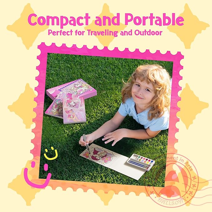 • All-in-one Watercolor Set:Packed with 3 unicorn coloring books, 3 brushes, 12 bright paints, and a mini palette, this set keeps everything kids need in one box. The books are easy to hold, so they can dive into painting right away, making it a fun travel coloring kit for kids.