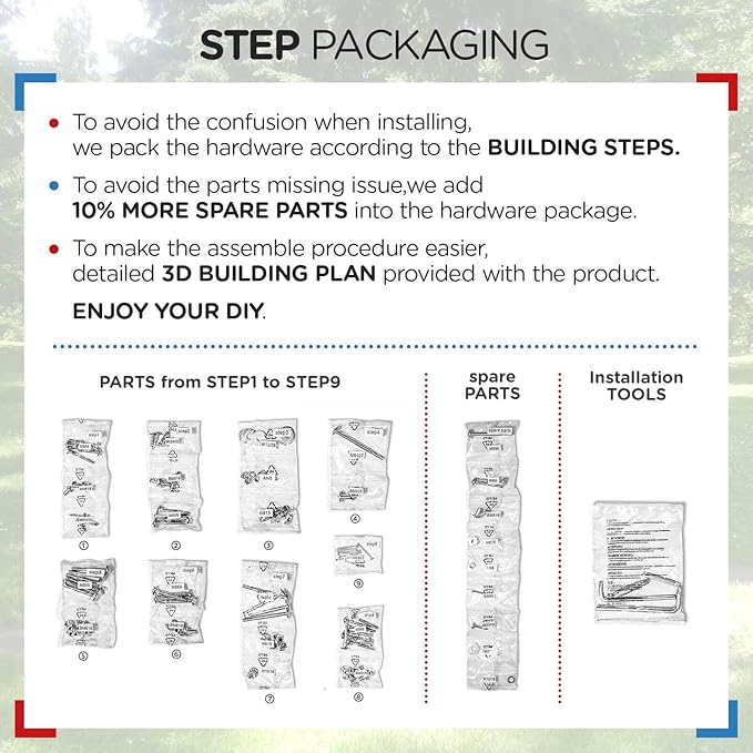 • ORDERLY PACKAGING: In order to avoid the confusing when installation, we pack the hardware according to the building steps; add 10% more spare parts into the hardware package; detailed 3D building plan makes the assemble procedure easier