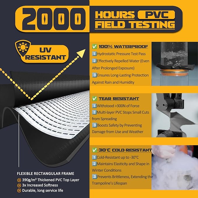 • 🏆️【Trusted Quality ULTRAPOWER SPORTS trampoline pad】 As a top-tier trampoline replacement mat brand, we prioritize safety and durability. We believe that you who appreciate quality will know how to choose wisely. The double industrial-grade stitching and triple-layer construction (PVC + PE + padding) outperform other flimsy covers. Whether replacing worn-out mats or upgrading old trampolines, choose our trampoline pad replacement that balances affordability with professional-grade performance.